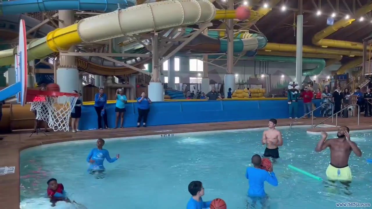 两人在游泳池 进行投射PK, 超级运动天地为Boys & Girls Club of Greater Houston俱乐部筹集了1万美元的善款。