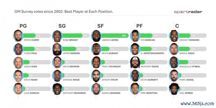 10月14日讯 今日,乒乓球无插件直播NBA数据专家Todd Whitehead统计了自从2002年以来联盟总经理调查投票对于“各个位置最佳球员”的得票最多球员。