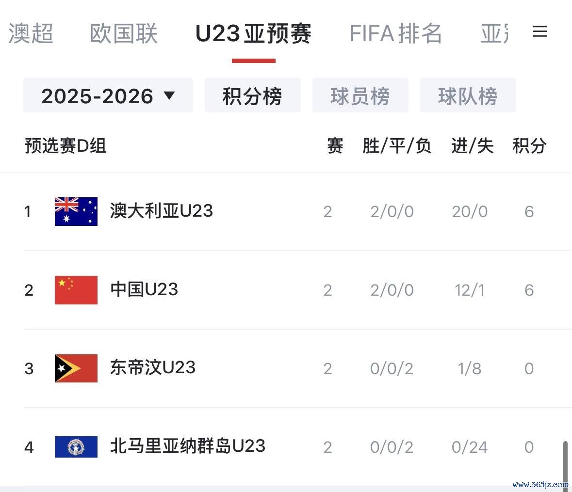 虎扑09月06日讯U23亚洲杯预选赛D组前两轮战罢,中国队2战全胜,打进12球丢1球排名第二, 超级运动天地追赶 第一澳大利亚9个净胜球。