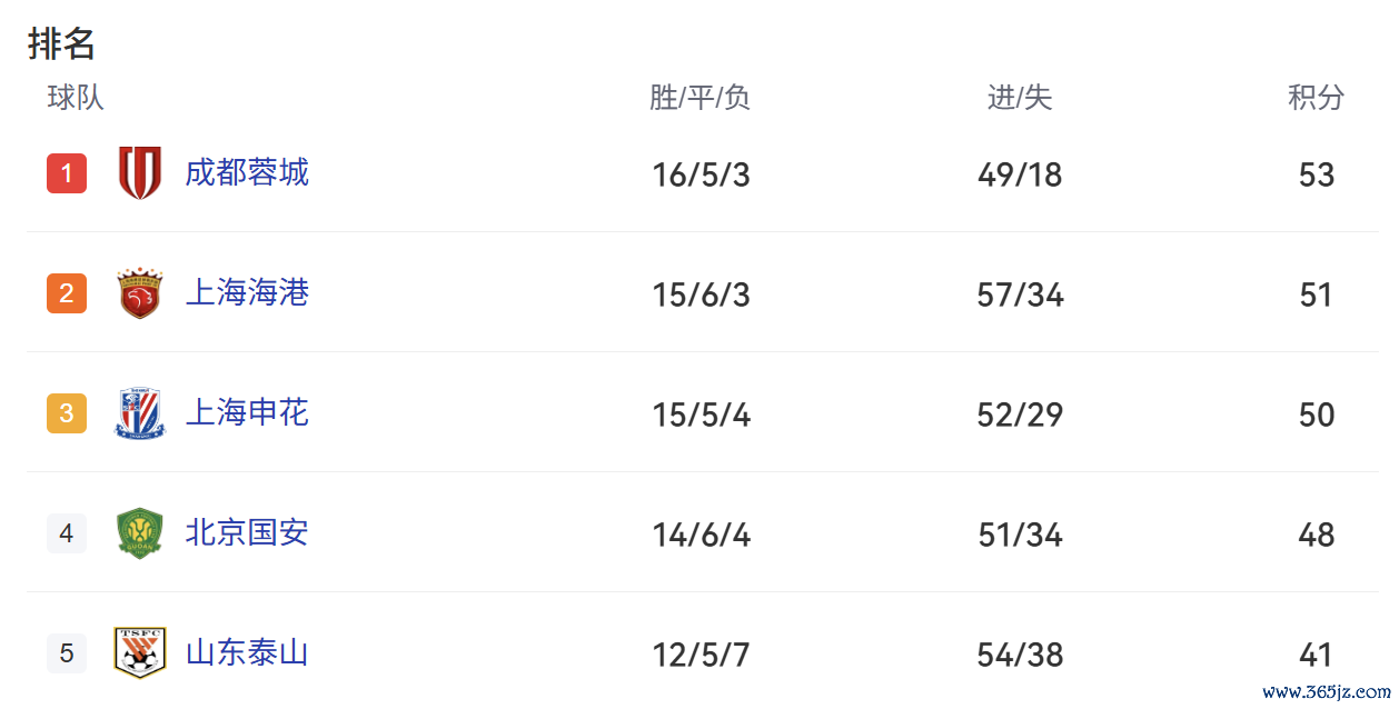 积分榜方面,上海申花积50分跌至第3,追赶 成都蓉城3分;山东泰山积41分保持第5。北京国安本轮0比2不敌河南队,而上海海港与成都蓉城均全取三分,积分榜前四名分差仅5分。