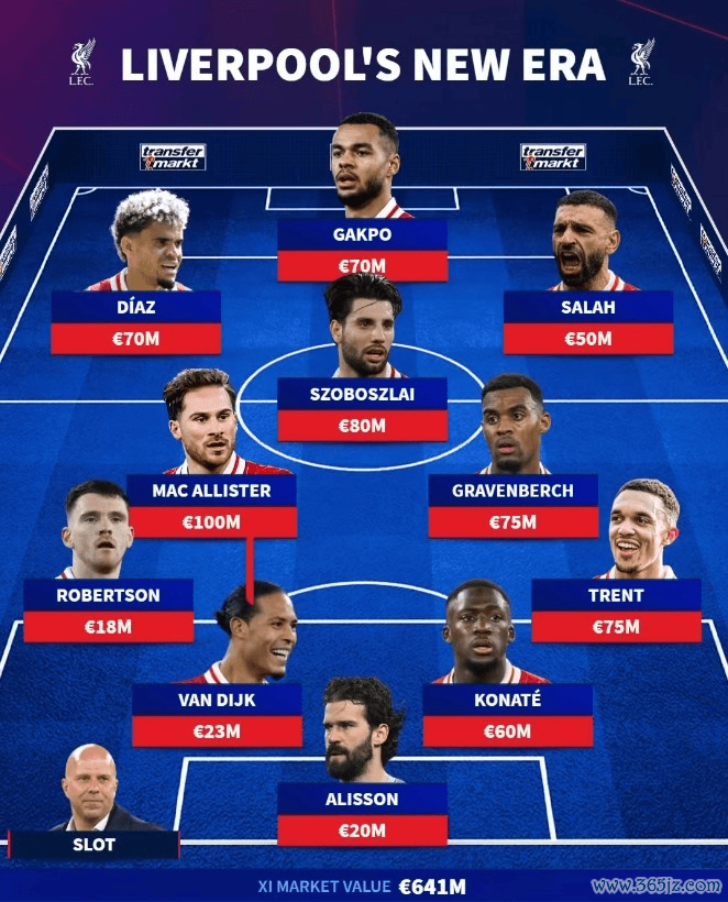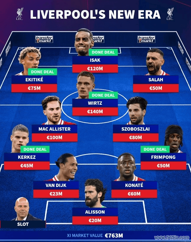 夏窗结束后, 利物浦主力阵形 出现五处更替, 总身价+1.2亿欧