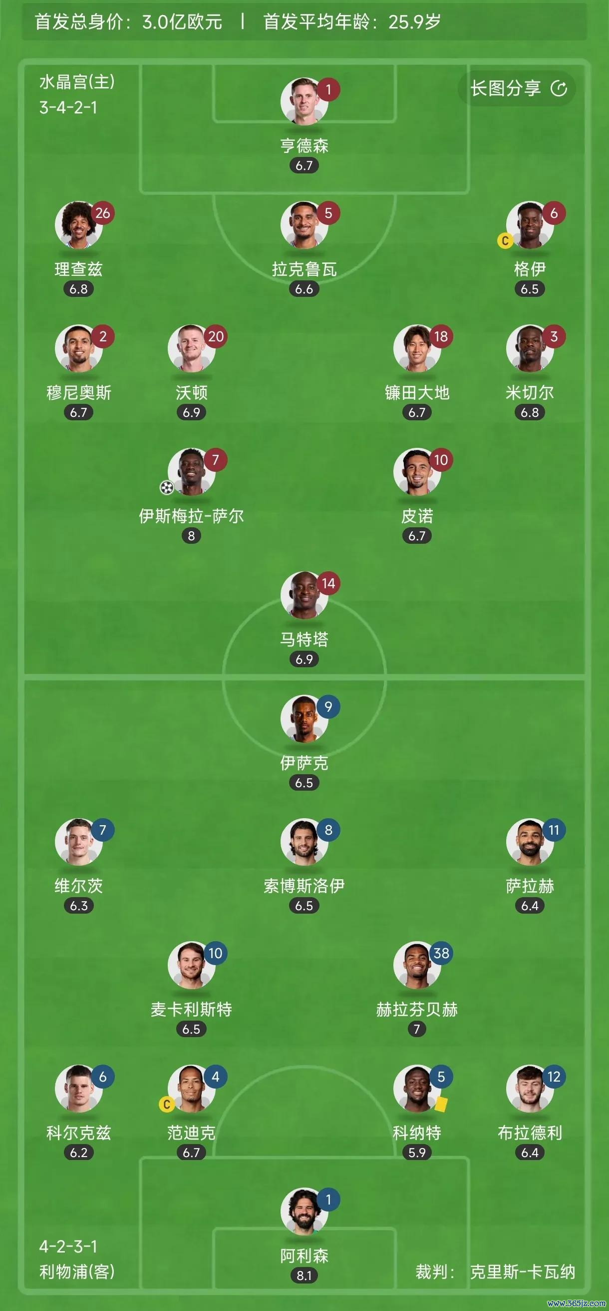水晶宫杆位:1-迪恩-亨德森、2-穆尼奥斯、3-米切尔、5-拉克鲁瓦、6-格伊、26-理查兹、18-镰田大地、20-沃顿、7-伊斯梅拉-萨尔、10-皮诺、14-马特塔